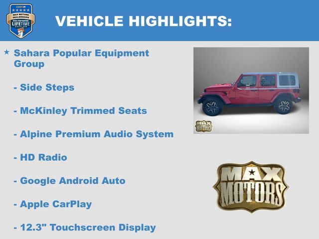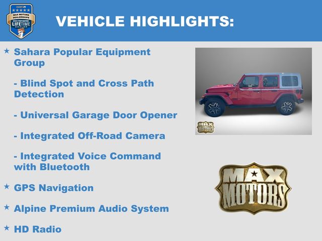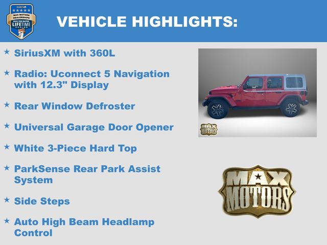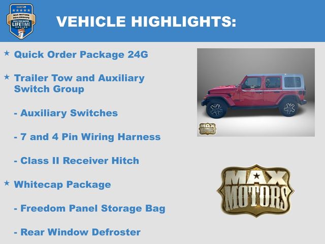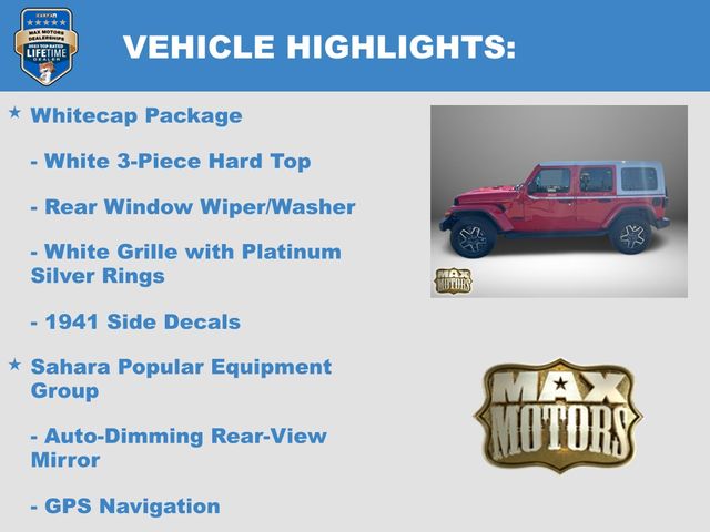 12.3" Touchscreen Display, 1941 Side Decals, 4G LTE Wi-Fi Hot Spot, Alpine Premium Audio System, Apple CarPlay, Auto High Beam Headlamp Control, Auto-Dimming Rear-View Mirror, Auxiliary Switches, Class II Receiver Hitch, Connectivity - US/Canada, For More Info, Call 800-643-2112, Freedom Panel Storage Bag, Google Android Auto, GPS Navigation, Hard Seat Back, HD Radio, Integrated Center Stack Radio, Integrated Off-Road Camera, Leather Wrapped Park Brake Handle, Leather Wrapped Shift Knob, McKinley Trimmed Seats, ParkSense Rear Park Assist System, Power 4-Way Driver Lumbar Adjust, Power 4-Way Passenger Lumbar Adjust, Power Adjust 8-Way Driver Seat, Power Adjust 8-Way Front Passenger Seat, Quick Order Package 24G, Rear Window Defroster, Rear Window Wiper/Washer, Sahara Popular Equipment Group, Side Steps, SiriusXM Radio Service, Universal Garage Door Opener, Wheels: 18" x 7.5" Machine/Painted Gray, White 3-Piece Hard Top, Whitecap Package.