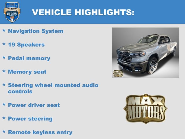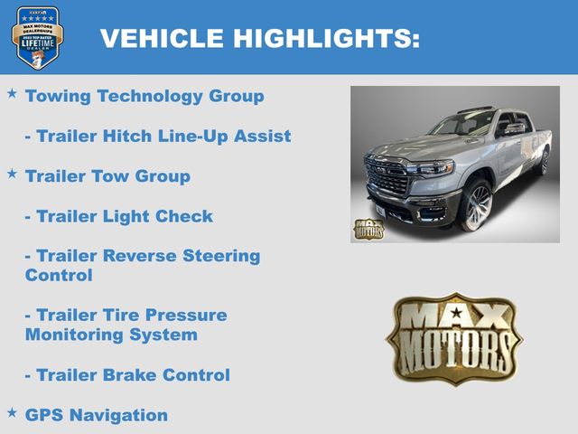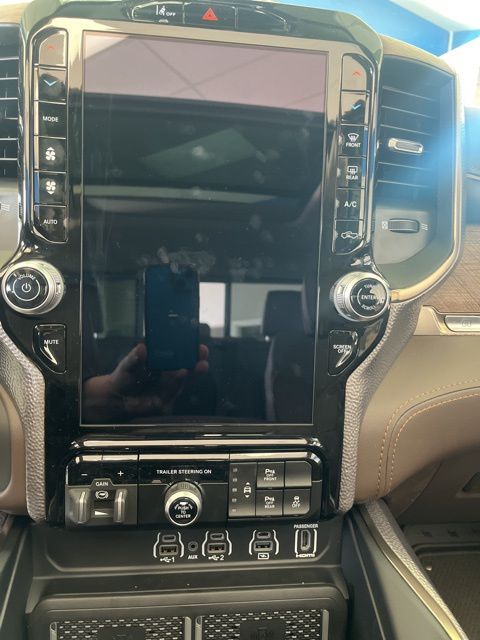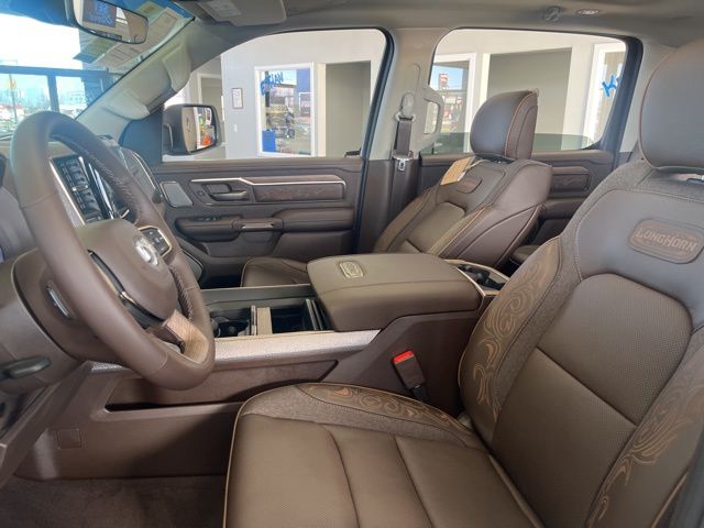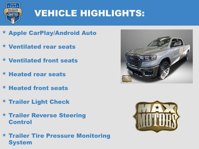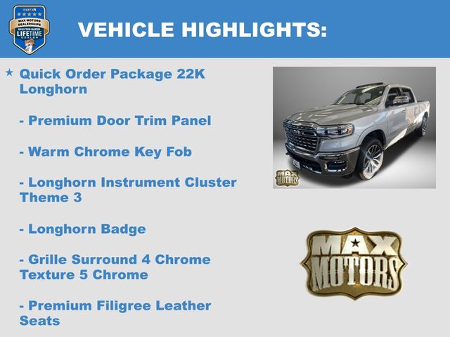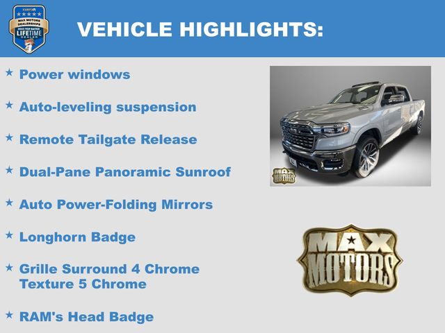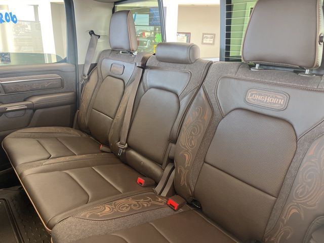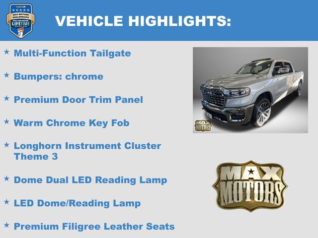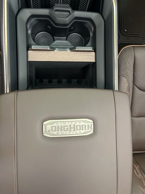 19 Speakers, Apple CarPlay/Android Auto, Auto Power-Folding Mirrors, Auto-leveling suspension, Bumpers: chrome, Dome Dual LED Reading Lamp, Dual-Pane Panoramic Sunroof, GPS Navigation, Grille Surround 4 Chrome Texture 5 Chrome, Heated front seats, Heated rear seats, LED Dome/Reading Lamp, Longhorn Badge, Longhorn Instrument Cluster Theme 3, Memory seat, Multi-Function Tailgate, Navigation System, Pedal memory, Power driver seat, Power steering, Power windows, Premium Door Trim Panel, Premium Filigree Leather Seats, Quick Order Package 22K Longhorn, RAM's Head Badge, Remote keyless entry, Remote Tailgate Release, Steering wheel mounted audio controls, Towing Technology Group, Trailer Brake Control, Trailer Hitch Line-Up Assist, Trailer Light Check, Trailer Reverse Steering Control, Trailer Tire Pressure Monitoring System, Trailer Tow Group, Ventilated front seats, Ventilated rear seats, Warm Chrome Key Fob.