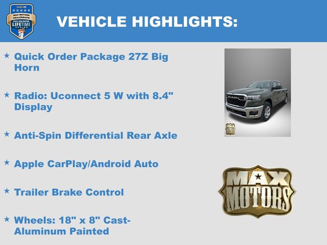 Anti-Spin Differential Rear Axle, Apple CarPlay/Android Auto, Quick Order Package 27Z Big Horn, Radio: Uconnect 5 W with 8.4" Display, Trailer Brake Control, Wheels: 18" x 8" Cast-Aluminum Painted.