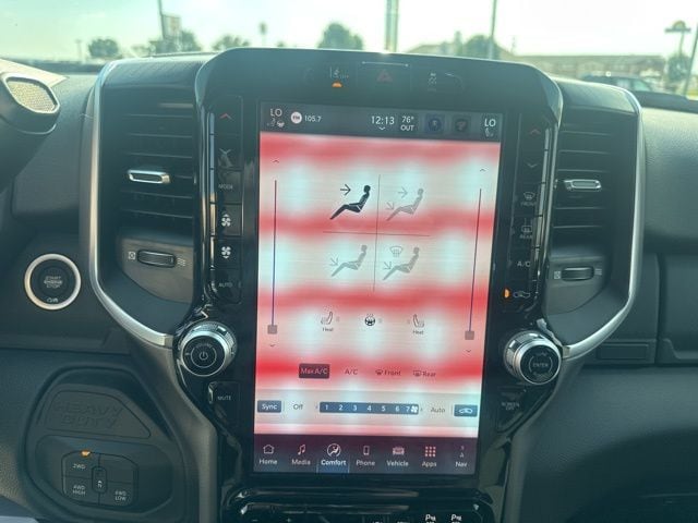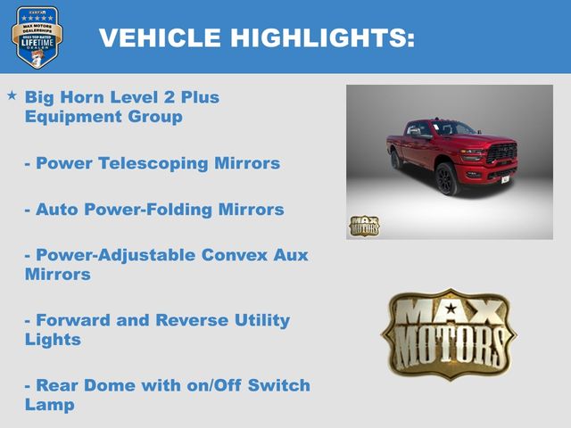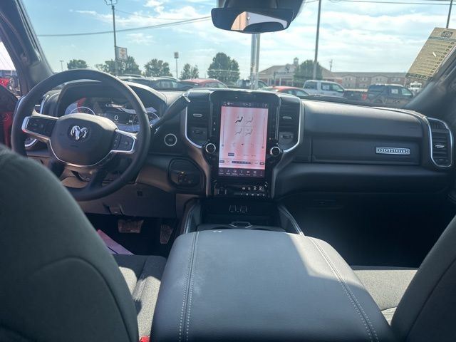 115V Auxiliary Rear Power Outlet, 12" Touchscreen Display, 2 Way Rear Headrest Seat, 4 Way Front Headrests, 400W Inverter, 4G LTE Wi-Fi Hot Spot, Active Lane Management System, Adaptive Steering System, Anti-Spin Differential Rear Axle, Apple CarPlay, Auto High Beam Headlamp Control, Auto Power-Folding Mirrors, Auto-Dimming Rear-View Mirror, Big Horn Level 2 Plus Equipment Group, Black Exterior Mirrors, Black Exterior Truck Badging, Black Interior Accents, Black Wheel Center Hub, Body Color Grille-Surround, Bucket Seats, Cluster 7.0" TFT Color Display, Cold Weather Group, Connectivity - US/Canada, Dampened Tailgate, Disassociated Touchscreen Display, Drowsy Driver Detection, Dual Glove Boxes, Dual Wireless Charging Pad, Emergency Vehicle Alert System (EVAS), Engine Block Heater, Exterior 115V AC Outlet, Exterior Mirrors Courtesy Lamps, Folding Flat Load Floor Storage, Footwell Courtesy Lamp, For Details, Visit DriveUconnect.com, For More Info, Call 800-643-2112, Front Seat Back Map Pockets, Full Length Upgraded Floor Console, Gloss Black Nostrils/Mic Black Grille, Glove Box Lamp, Google Android Auto, GPS Antenna Input, GPS Navigation, HD Radio, Heated Front Seats, Heated Steering Wheel, LED Bed Lighting, LED Tail Lamps, Locking Lower Glove Box, Luxury Steering Wheel, Manual Adjust 4-Way Front Passenger Seat, Mirror Running Lights, MOPAR Deployable Bed Step, MOPAR Winter Front Grille Cover, Night Edition, Off-Road Info Pages, Painted Front Bumper, Painted Rear Bumper, Power 2-Way Driver Lumbar Adjust, Power Adjust 8-Way Driver Seat, Power Adjust Mirrors, Power Adjustable Pedals, Power Heated Folding Telescopic Mirrors, Power Telescoping Mirrors, Power-Adjustable Convex Aux Mirrors, Premium Cloth Bucket Seats, Quick Order Package 24Z Big Horn, Rain Sensitive Windshield Wipers, Rear 60/40 Folding Seat, Rear Power Sliding Window, Red Tail Lamp Bezels, Remote Start System, Selectable Tire Fill Alert, SiriusXM Radio Service, Steering Wheel Mounted Audio Controls, Surround View Camera System, Traffic Sign Recognition, Trailer Reverse Guidance, Trailer Tire Pressure Monitoring System, Trailer Tow Pages, Universal Garage Door Opener, Wheels: 20" x 8.0" Black Painted Aluminum.