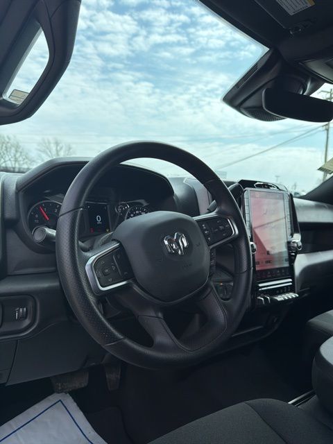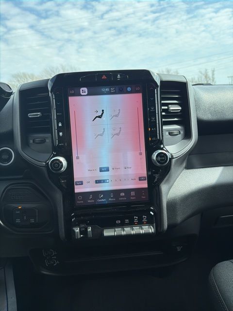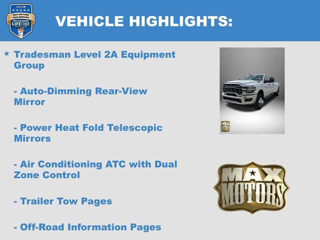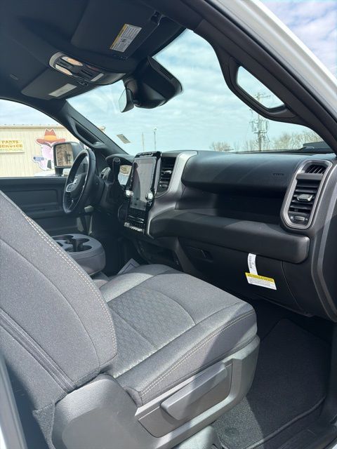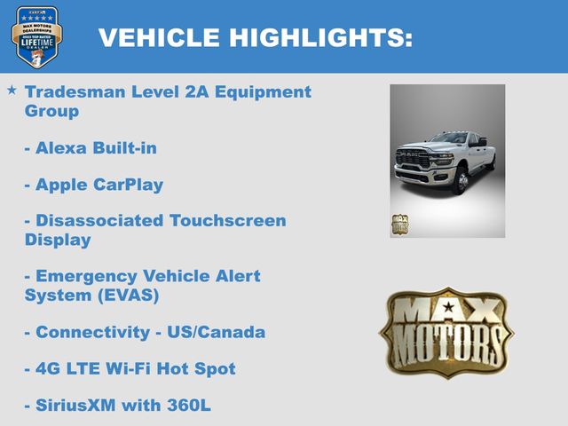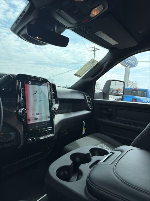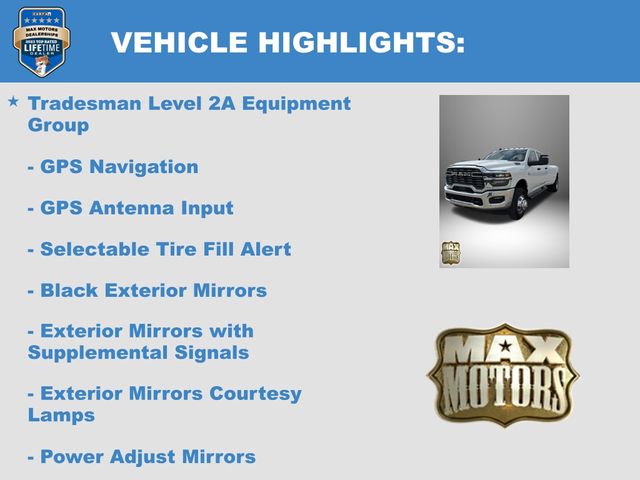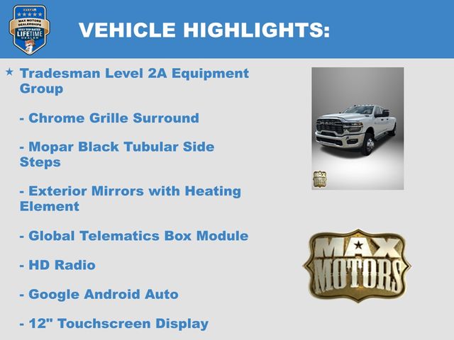 115-Volt Auxiliary Front Power Outlet, 12" Touchscreen Display, 2 Way Rear Headrest Seat, 4 Way Front Headrests, 40/20/40 Split Bench Seat, 400W Inverter, 4G LTE Wi-Fi Hot Spot, Air Conditioning ATC with Dual Zone Control, Alexa Built-in, Apple CarPlay, Apple CarPlay/Android Auto, Auto-Dimming Rear-View Mirror, Bed Utility Group, Black Exterior Mirrors, Bright Front Bumper, Bright Rear Bumper, Bright Wheel Skins, Carpet Floor Covering, Center Hub, Chrome Grille Surround, Cloth 40/20/40 Bench Seat, Connected Travel and Traffic Services, Connectivity - US/Canada, Convenience Group, Disassociated Touchscreen Display, Emergency Vehicle Alert System (EVAS), Exterior 115V AC Outlet, Exterior Mirrors Courtesy Lamps, Exterior Mirrors with Heating Element, Exterior Mirrors with Supplemental Signals, For Details Visit DriveUconnect.com, For More Info, Call 800-643-2112, Front and Rear Floor Mats, Front Armrest with Cupholders, Global Telematics Box Module, Google Android Auto, GPS Antenna Input, GPS Navigation, HD Radio, Integrated Voice Command with Bluetooth, LED Bed Lighting, Manual Adjust 4-Way Driver Seat, Manual Adjust 4-Way Front Passenger Seat, Manual Folding Exterior Mirrors, Manual Telescoping Mirrors, Matte Black Mesh with Chrome Grille, Mirror Running Lights, Mopar Black Tubular Side Steps, MOPAR Deployable Bed Step, MOPAR Spray in Bedliner, Off-Road Information Pages, ParkSense Front/Rear Park Assist System, Power Adjust Mirrors, Power Heat Fold Telescopic Mirrors, Power-Adjustable Convex Aux Mirrors, Quick Order Package 24A Tradesman, Radio: Uconnect 5 Navigation with 12.0" Display, Rear Folding Seat, Rear Power Sliding Window, Remote USB Port - Charge Only, Selectable Tire Fill Alert, SiriusXM Radio Service, SiriusXM with 360L, Storage Tray, Tinted Acoustic Windshield Glass, Tradesman Level 2A Equipment Group, Trailer Tow Pages.
