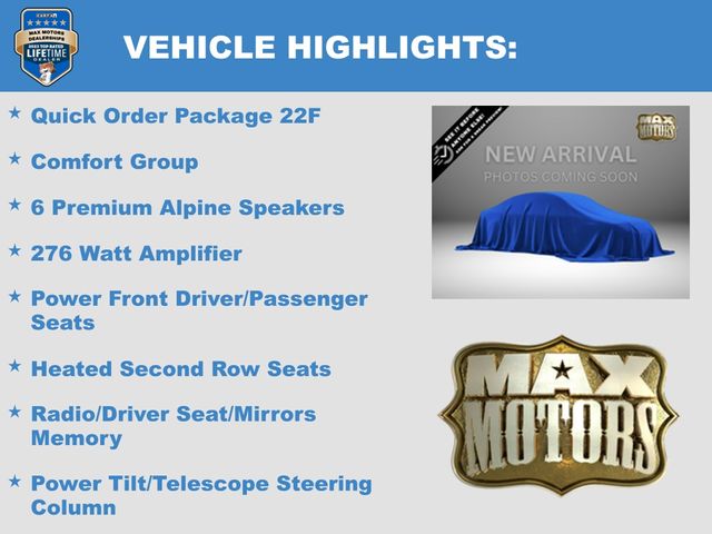 276 Watt Amplifier, 6 Premium Alpine Speakers, Adaptive Bi-Xenon HID Headlamps, Auto-Dimming Rear-View Mirror, Automatic Headlamp Leveling System, Blind Spot & Cross Path Detection, Body Color Exterior Mirrors, Comfort Group, Delete Power Backlight Sunshade, Deluxe Security Alarm, Door Sill Scuff Pads, Driver & Passenger Lower LED Lamps, Exterior Mirrors Courtesy Lamps, Exterior Mirrors w/Heating Element, Exterior Mirrors w/Supplemental Signals, Front & Rear LED Map Pocket Lights, Heated Front Seats, Heated Second Row Seats, Heated Steering Wheel, Leather w/Perforated Insert Bucket Seats, Power 2-Way Driver Lumbar Adjust, Power 2-Way Passenger Lumbar Adjust, Power Front Driver/Passenger Seats, Power Multi Function Mirror Manual Fold, Power Tilt/Telescope Steering Column, Quick Order Package 22F, Radio/Driver Seat/Mirrors Memory, Rear Armrest w/Cupholder Seat, Ventilated Front Seats.