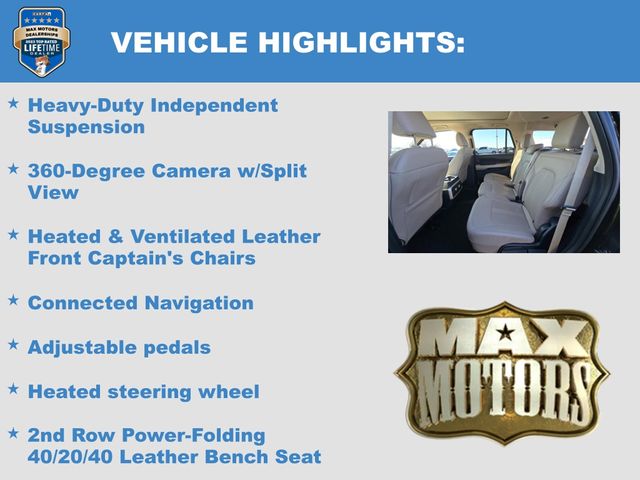 4WD, 2nd Row Power-Folding 40/20/40 Leather Bench Seat, 3.31 Axle Ratio, 360-Degree Camera w/Split View, Adjustable pedals, Connected Navigation, Ebony Black Mesh Grille, Equipment Group 302A High Package, Front Bucket Seats, Heated & Ventilated Leather Front Captain's Chairs, Heated steering wheel, Heavy-Duty Independent Suspension, Magnetic-Painted Power Deployable Running Boards, Navigation system: Connected Navigation, Panoramic Vista Roof, Power passenger seat, Power-Folding Sideview Mirrors w/Autofold, Ventilated front seats, Wheels: 22" 12-Spoke Polished Aluminum.