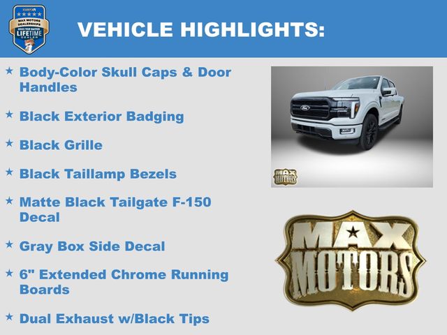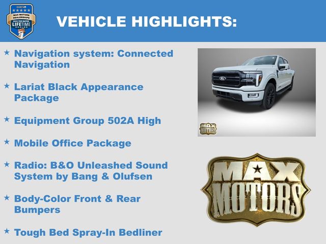 $75995.00 Original MSRP, Premium, capable full-size pickup with strong performance, refined comfort, and advanced tech. The 2024 F-150 Lariat offers a powerful engine, upscale interior features, and modern safety systemsready for work, play, and everything in between., 3.5L PowerBoost Full-Hybrid V6, 4WD, 2nd Row Heated Seats, 6" Extended Chrome Running Boards, Black Exterior Badging, Black Grille, Black Taillamp Bezels, Body-Color Front & Rear Bumpers, Body-Color Skull Caps & Door Handles, Console Worksurface, Dark Interior Appliques, Dual Exhaust w/Black Tips, Equipment Group 502A High, Gray Box Side Decal, Heads-Up Display, Lariat Black Appearance Package, Leather-Trimmed Bucket Seats, Matte Black Tailgate F-150 Decal, Mobile Office Package, Navigation system: Connected Navigation, Partitioned Lockable Rear Storage, Radio: B&O Unleashed Sound System by Bang & Olufsen, Tough Bed Spray-In Bedliner, Wheels: 20" Gloss Black Painted Aluminum, Wireless Charging.