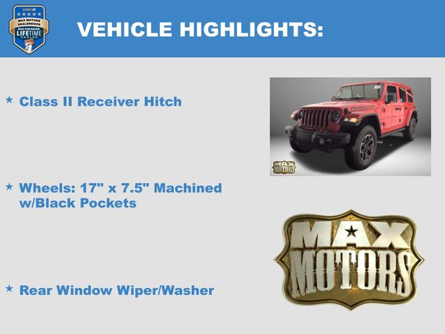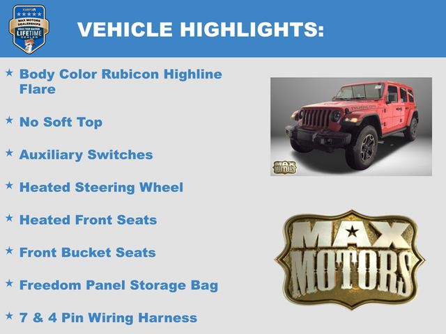 240 Amp Alternator, 7 & 4 Pin Wiring Harness, 700 Amp Maintenance Free Battery, Auxiliary Switches, Body Color 3-Piece Hard Top, Body Color Rubicon Highline Flare, Class II Receiver Hitch, Cold Weather Group, Freedom Panel Storage Bag, Front Bucket Seats, Heated Front Seats, Heated Steering Wheel, Navigation System, No Soft Top, Quick Order Package 26R, Rear Window Defroster, Rear Window Wiper/Washer, Trailer Tow & HD Electrical Group, Wheels: 17" x 7.5" Machined w/Black Pockets.