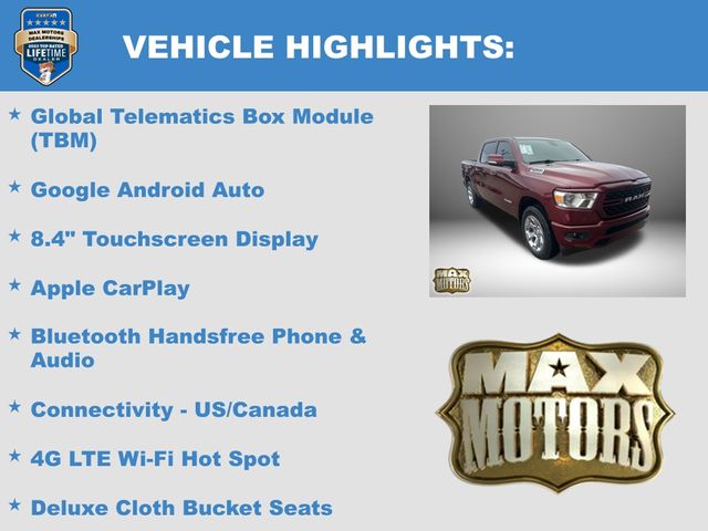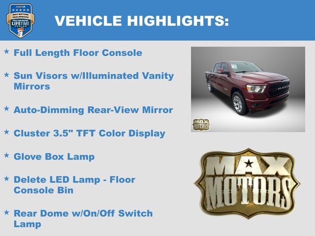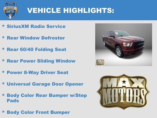 2nd Row In Floor Storage Bins, 3 Rear Seat Head Restraints, 4 Way Front Headrests, 4G LTE Wi-Fi Hot Spot, 8.4" Touchscreen Display, All Plant-Installed Decals, Apple CarPlay, Auto-Dimming Exterior Driver Mirror, Auto-Dimming Rear-View Mirror, Big Horn Badge, Big Horn Level 1 Equipment Group, Black Exterior Mirrors, Black Interior Accents, Black Premium Power Mirrors, Bluetooth Handsfree Phone & Audio, Body Color Exterior Mirrors, Body Color Front Bumper, Body Color Premium Power Mirrors, Body Color Rear Bumper w/Step Pads, Bridgestone Brand Tires, Bucket Seats, Class IV Receiver Hitch, Cluster 3.5" TFT Color Display, Connectivity - US/Canada, Convex Wide-Angle Mirror Insert, Delete LED Lamp - Floor Console Bin, Deluxe Cloth Bucket Seats, Exterior Mirrors Courtesy Lamps, Exterior Mirrors w/Heating Element, Exterior Mirrors w/Supplemental Signals, For Details, Visit DriveUconnect.com, Front Seat Back Map Pockets, Full Length Floor Console, Global Telematics Box Module (TBM), Glove Box Lamp, Google Android Auto, GPS Antenna Input, GPS Navigation, Integrated Center Stack Radio, Manual Adjust 4-Way Front Passenger Seat, Power 2-Way Driver Lumbar Adjust, Power 8-Way Driver Seat, Power Adjustable Pedals, Power-Folding Mirrors, Quick Order Package 27Z Big Horn, Radio: Uconnect 5 W w/8.4" Display, Rear 60/40 Folding Seat, Rear Center Armrest, Rear Dome w/On/Off Switch Lamp, Rear Power Sliding Window, Rear Window Defroster, SiriusXM Radio Service, SiriusXM Satellite Radio, Sport Appearance Package, Sport Decal, Sun Visors w/Illuminated Vanity Mirrors, Universal Garage Door Opener, USB Host Flip.