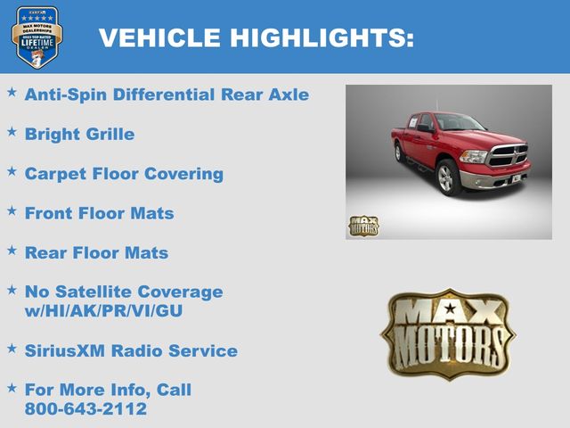 20" x 8" Aluminum Wheels, 40/20/40 Split Bench Seat, Anti-Spin Differential Rear Axle, Body Color Upper Fascia, Bright Front Bumper, Bright Grille, Bright Rear Bumper, Carpet Floor Covering, Center Hub, Cloth 40/20/40 Bench Seat, Dual Rear Exhaust w/Bright Tips, For More Info, Call 800-643-2112, Front Armrest w/3 Cupholders, Front Floor Mats, Front Fog Lamps, Manual Adjust Seats, No Satellite Coverage w/HI/AK/PR/VI/GU, Quick Order Package 26B Tradesman, Rear Floor Mats, Rear Folding Seat, Remote Keyless Entry w/All-Secure, SiriusXM Radio Service, SiriusXM Satellite Radio, Storage Tray, Tradesman Package, Tradesman SXT Package.